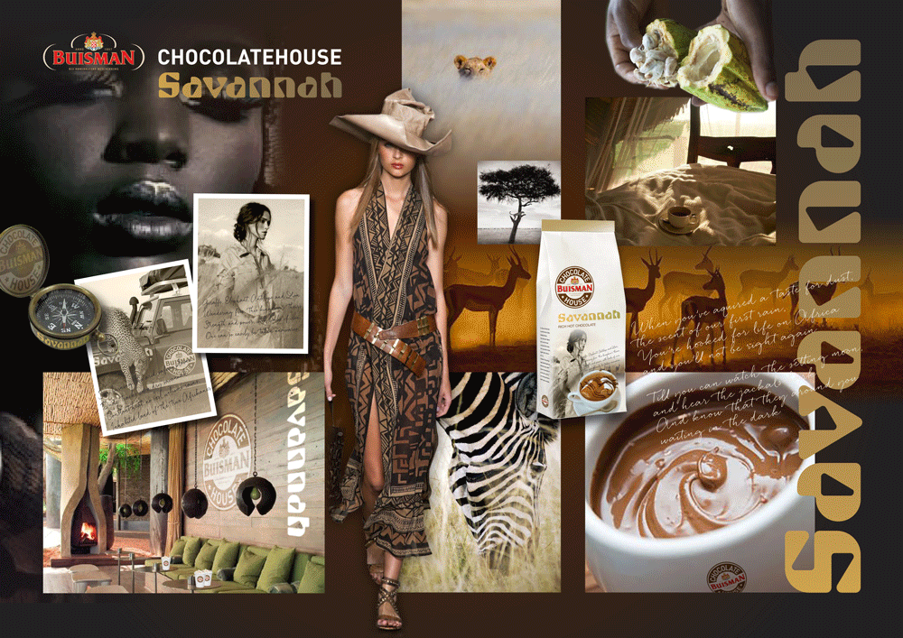 Assignment: design a series of themed mood boards for a new Buisman ‘Chocolate House’ drink range. The mood boards were used as a reference point for the development of the ‘Chocolate House’ packaging and sales merchandise.