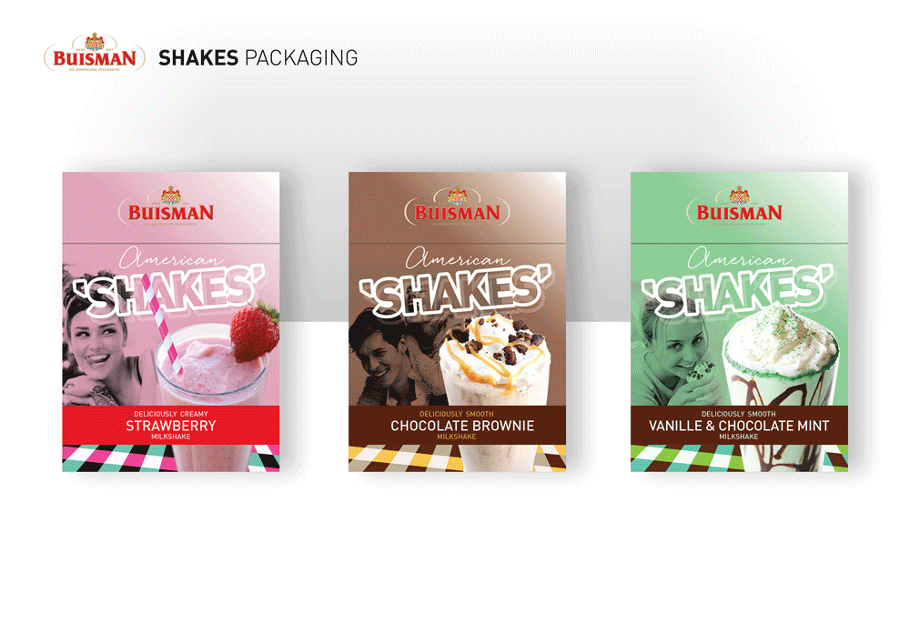 Assignment: design a couple of concept mood boards for a new Buisman Milkshake mix. One called ‘American Shakes’ to have a 1950’s influence and the other ‘Shakers’ to be more contemporary. Also give an impression of how the packaging could look.